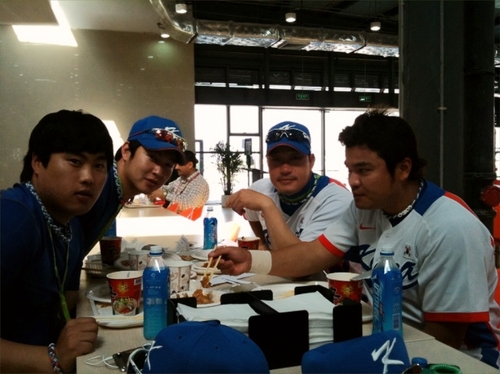 봉중근은 11일 오후 미투데이에 ‘짜잔~룸메이트 브라더들 공개! 현진,은범,신수와 함께 간식먹는 중이에요.음식이 입에 잘 안맞아서 고생하는 선수들도 있지만 전 어딜가든 없어서 못먹는..ㅎㅎ오늘 빼빼로는 못먹었지만 한국표 신라면으루 대리만족 하려구요~저녁들 맛나게 드세요!’라며 남자 선수들끼리 라면을 먹고 있는 사진을 올렸다.