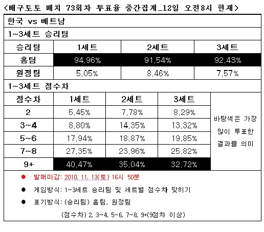 1~3세트 승리팀과 점수차를 알아맞히는 배구토토 매치 73회차 게임에서 세트별 예상 승리팀은 모두 한국으로 나타났고, 세트별 투표율을 보면 1세트는 94.96%, 2세트는 91.54%, 3세트는 92.43%로 한국의 압도적인 승리를 점쳤다.