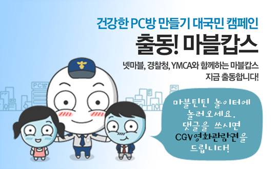 게임포탈 넷마블을 운영하고 있는 CJ인터넷은 경찰청, YMCA와 함께 건강한 PC방 만들기 캠페인 ‘출동! 마블캅스’를 론칭하고 넷마블 사이트 및 전국 8,500개 피카PC방을 통해 서비스를 실시한다.
