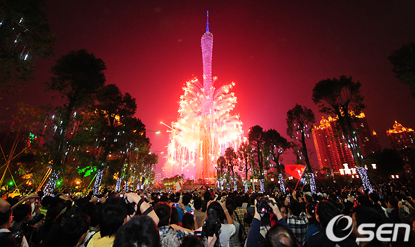 광저우 타워에 아시안게임 개막을 알리는 불꽃놀이가 하고 있다 ./jpnews@osen.co.kr