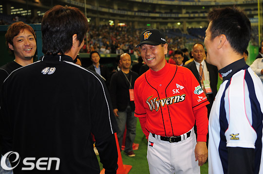 SK 김성근 감독이 지바 롯데 선수들과 즐겁게 얘기를 나누고 있다.