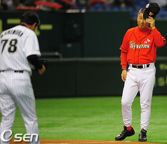 양팀 소개 시간에 SK 김성근 감독과 지바 롯데 니시무라 노리후미 감독이 인사를 나누고 있다./rumi@osen.co.kr
