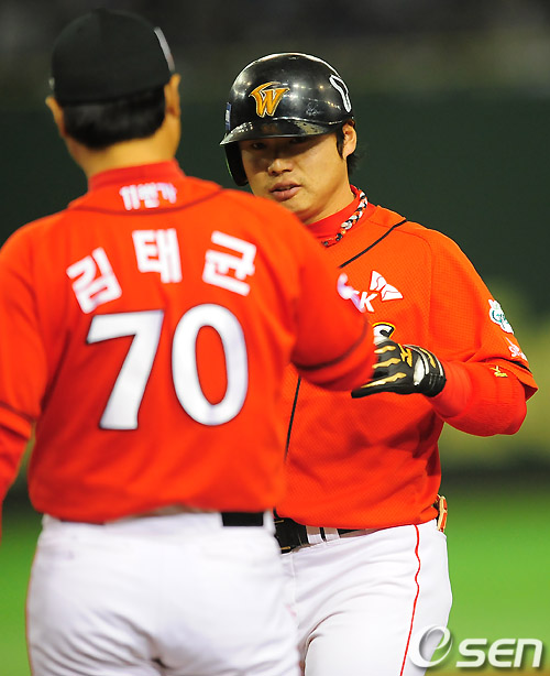 1회초 박재상이 첫 안타를 치고 나가 김태균 1루 코치와 주먹을 마주치고 있다. /rumi@osen.co.kr