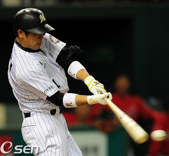 2회말 2사 만루 지바 기요타가 카도쿠라의 포크볼을 받아쳐 2타점 적시타를 치고 있다. /rumi@osen.co.kr