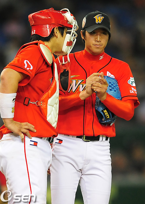 5회말 전병두가 이마에에게 홈런을 맞자 정상호가 마운드에 올라 격려를 하고 있다. /rumi@osen.co.kr