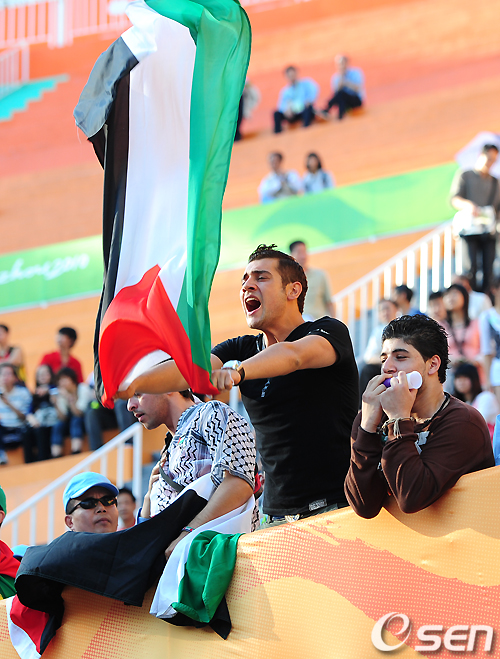 팔레스타인 응원단이 국기를 흔들며 열띤 응원을 펼치고 있다. /jpnews@osen.co.kr