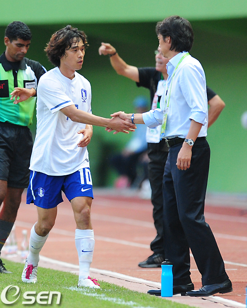 후반 박주영이 교체되며 홍명보 감독과 악수를 나누고 있다. /jpnews@osen.co.kr