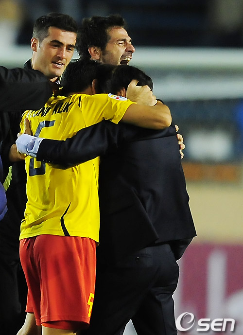 경기를 마치고 성남 신태용 감독이 첫번째 골은 넣은 사샤(샤샤), 두번째 골은 넣은 조병국과 포옹을 하고 있다./rumi@osen.co.kr