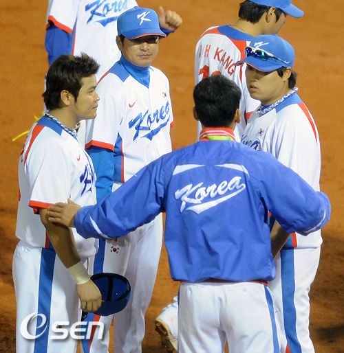경기 종료후 추신수, 류현진에게 한국팀 관계자가 인터뷰 요청을 하고 있다. /ajyoung@osen.co.kr