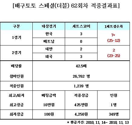 [배구토토] 2010광저우아시안게임 배구를 대상으로 하는 배구토토 스페셜 62회차 게임에서 총 1,239명의 적중자가 나왔다.