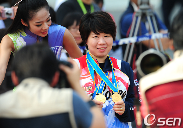김윤미가 금메달을 들며 취재진에 포즈를 취하고 있다. /jpnews@osen.co.kr