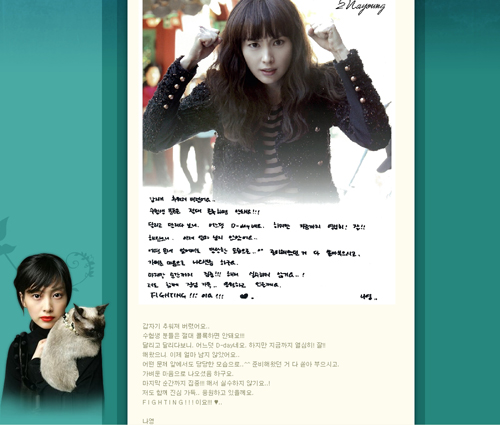 이나영은 지난 12일 공식 홈페이지에 두 주먹을 불끈 쥐고 파이팅을 외치는 모습의 사진과 함께 자필로 적은 따뜻한 격려 담긴 글을 올렸다.