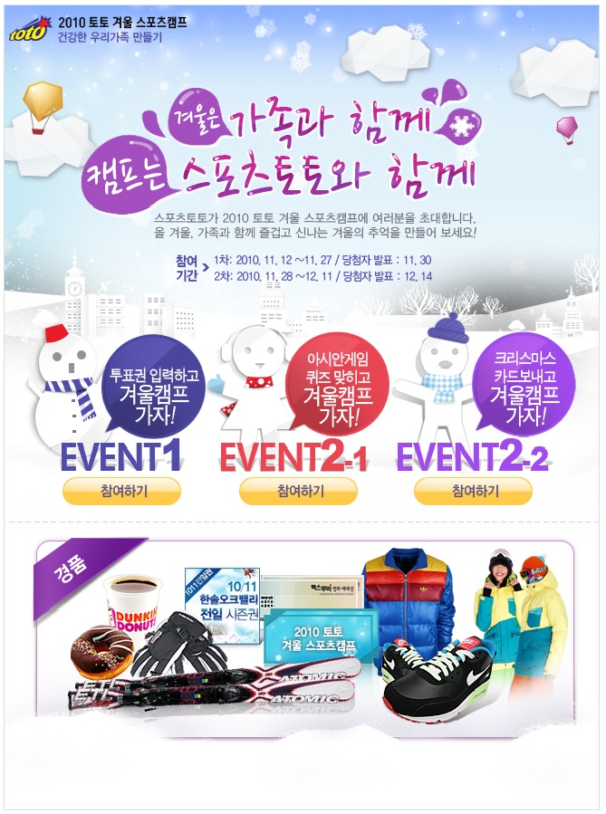2010 토토 겨울 스포츠 캠프는 오는 27일(토)까지 1차 참가자를 모집하고, 당첨자는 30일(화) 발표된다. 2차 참가자는 오는 28일(일)부터 다음달 11일(토)까지 신청이 가능하고, 당첨자는 12월 14일(화) 베트맨 홈페이지를 통해 발표된다.