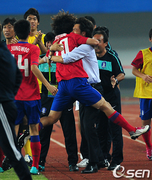 후반 5분 박주영이 프리킥을 골로 연결시키고 홍명보 감독과 뜨겁게 포옹을 하고 있다. /jpnews@osen.co.kr
