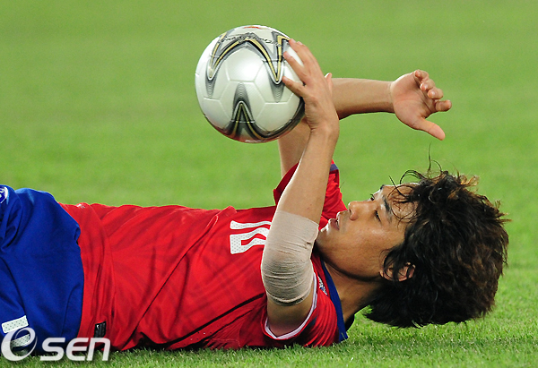 박주영이 중국선수의 태클에 운동장에 쓰러져 있다. /jpnews@osen.co.kr
