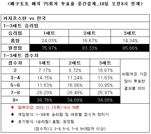 1~3세트 승리팀과 점수차를 맞히는 배구토토 매치 게임에서 각 세트별 예상 승리팀은 모두 한국으로 나타났고, 세트 별 투표율도 1세트 75.97%, 2세트 83.33%, 3세트 85.66%로 한국의 승리가 압도적으로 많았다.