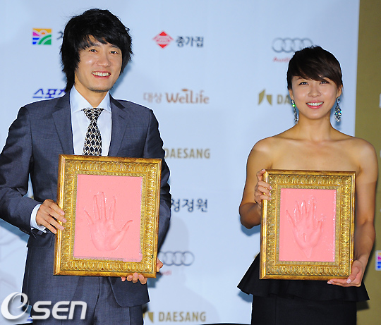 무대 위에서 김명민과 하지원이 핸드프린팅본을 들고 포토타임을 갖고 있다./rumi@osen.co.kr