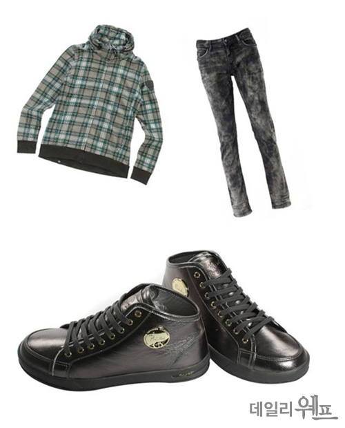 깔끔하게 핏을 마무리해주는 체크 패턴의 하이네크라인의 점퍼와 나염 느낌의 다크 그레이 컬러 데님과 함께, 샤이니한 그레이 스니커즈로 세련되고 발랄함을 연출했다.