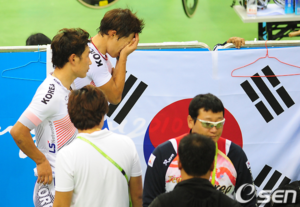 17일 오전 중국 광저우 벨르드롬 체육관에서 열린 아시안게임 사이클 남자 개인 포인트 경기에서 금메달 획득에 실패한 조호성과 장선재가 아쉬워하고 있다.