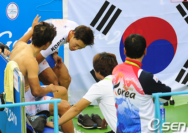 17일 오전 중국 광저우 벨르드롬 체육관에서 열린 아시안게임 사이클 남자 개인 포인트 경기에서 금메달 획득에 실패한 조호성과 장선재가 서로를 격려하고 있다.