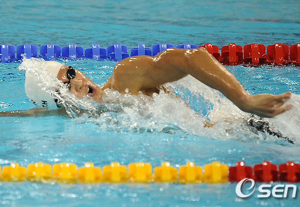 3레인서 레이스를 시작한 박태환은 첫 50m를 27.24에 3위로 끊은 뒤 100m서 56.50초로 2위로 올라섰다. 200m도 1분56초10으로 2위로 끊은 박태환은 3위 장린(중국)과는 여유를 둔 채 2위로 물살을 헤쳐나가며 쑨양을 추격했다.