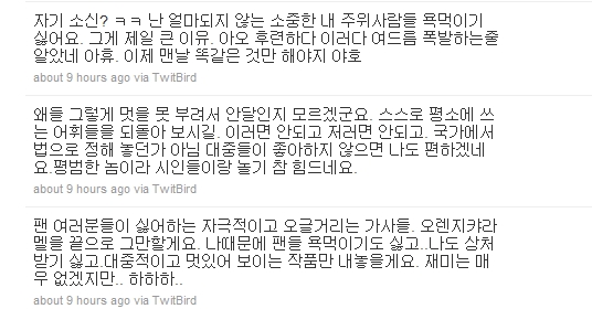 휘성은 18일 자신의 트위터에 "팬 여러분들이 싫어하는 자극적이고 오글거리는 가사들은 오렌지 캬라멜을 끝으로 그만하겠다. 팬들 욕 먹이고 나도 상처받기 싫다. 재미는 없겠지만 대중적이고 멋있어 보이는 작품만 내놓겠다"라고 말문을 열었다.