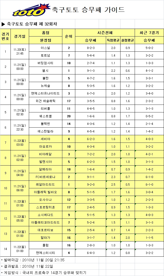 이번 축구토토 승무패 32회차는 20일 오후 9시 35분에 발매 마감되며 모든 경기가 종료된 22일 결과가 발표된다.