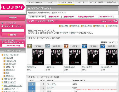 2PM이 일본 최대 모바일 벨소리 사이트 ‘레코쵸크’의 차트를 화려하게 수놓은 것.