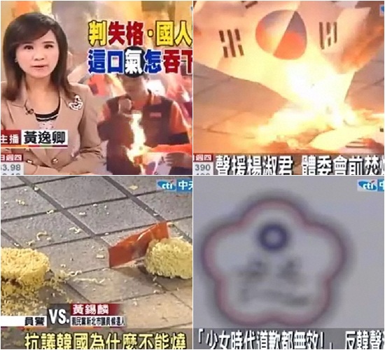 대만에서 자국 태권도 선수의 실격패 판정에 대한 분노가 반한 감정으로 번지고 있는 가운데, 뜬금없이 "소녀시대가 사과해도 소용없다!"라는 멘트가 뉴스에서 등장한 것.