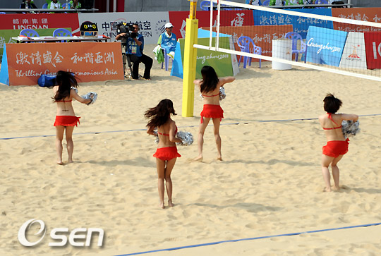 19일 한국의 이선화 곽미정 조가 스리랑카와 D조 조별리그 마지막 경기를 펼친 광저우 아시안게임 비치발리볼 경기장은 치어리더 공연으로도 유명하다. 매 경기가 끝나고 펼치지는 치어리더 공연은 경기장을 찾은 관객들의 흥을 돋우기 위한 서비스로 인기를 얻고 있으나 선수들의 경기력에 지장을 준다는 지적도 받고 있다. 치어리더들이 신나는 율동을 펼치고 있다.