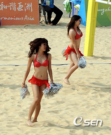 19일 한국의 이선화 곽미정 조가 스리랑카와 D조 조별리그 마지막 경기를 펼친 광저우 아시안게임 비치발리볼 경기장은 치어리더 공연으로도 유명하다. 매 경기가 끝나고 펼치지는 치어리더 공연은 경기장을 찾은 관객들의 흥을 돋우기 위한 서비스로 인기를 얻고 있으나 선수들의 경기력에 지장을 준다는 지적도 받고 있다. 치어리더들이 신나는 율동을 펼치고 있다.