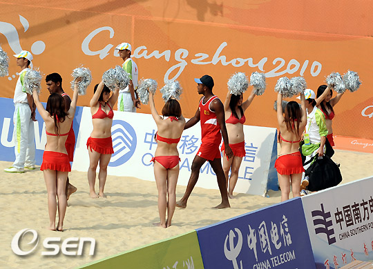 19일 한국의 이선화 곽미정 조가 스리랑카와 D조 조별리그 마지막 경기를 펼친 광저우 아시안게임 비치발리볼 경기장은 치어리더 공연으로도 유명하다. 매 경기가 끝나고 펼치지는 치어리더 공연은 경기장을 찾은 관객들의 흥을 돋우기 위한 서비스로 인기를 얻고 있으나 선수들의 경기력에 지장을 준다는 지적도 받고 있다. 치어리더들이 터널을 만들어 선수 입장식을 치르고 있다.