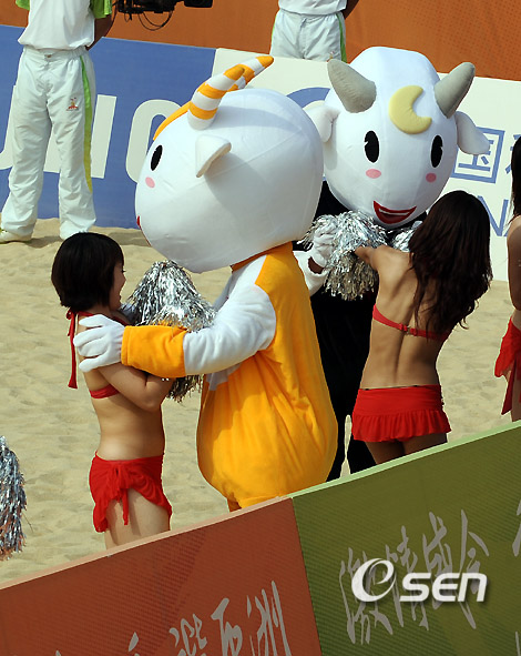 19일 한국의 이선화 곽미정 조가 스리랑카와 D조 조별리그 마지막 경기를 펼친 광저우 아시안게임 비치발리볼 경기장은 치어리더 공연으로도 유명하다. 매 경기가 끝나고 펼치지는 치어리더 공연은 경기장을 찾은 관객들의 흥을 돋우기 위한 서비스로 인기를 얻고 있으나 선수들의 경기력에 지장을 준다는 지적도 받고 있다. 광저우 아시안게임의 마스코트인 다섯마리 염소(오양)들이 치어리더들과 어울려 익살을 떨고 있다.