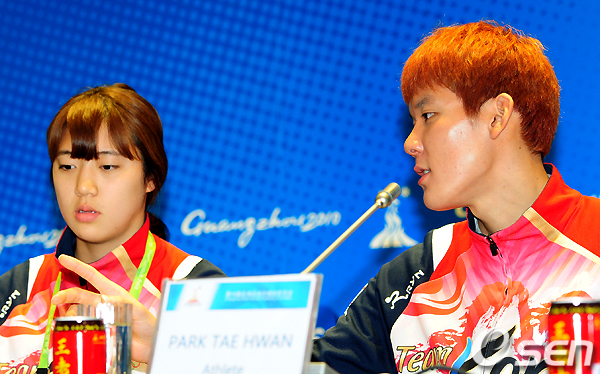 박태환과 정다래가 20일 오전 중국 광저우 미디어 프레스센터 내 컨퍼런스룸에서 기자회견을 가졌다.