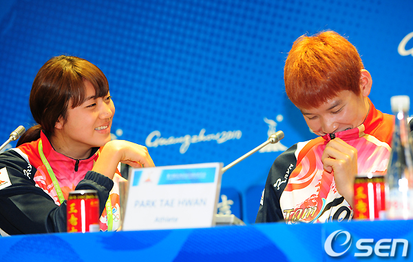 박태환과 정다래가 20일 오전 중국 광저우 미디어 프레스센터 내 컨퍼런스룸에서 기자회견을 가졌다.