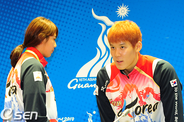 박태환과 정다래가 20일 오전 중국 광저우 미디어 프레스센터 내 컨퍼런스룸에서 기자회견을 가졌다.