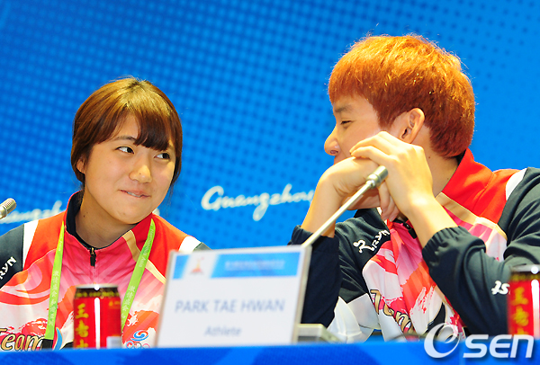 박태환과 정다래가 20일 오전 중국 광저우 미디어 프레스센터 내 컨퍼런스룸에서 기자회견을 가졌다.