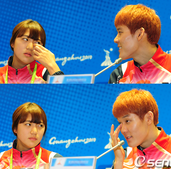 박태환과 정다래가 20일 오전 중국 광저우 미디어 프레스센터 내 컨퍼런스룸에서 기자회견을 가졌다.