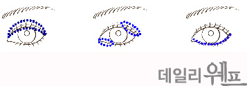 (파란부분)표시된 부분처럼 쌍꺼플 라인에 펄 제품을 펴발라 주면, 화사하면서도 여성스러운 느낌을 연출할 수있다. 눈앞이나 눈꼬리에 포인트만 주면 톡톡튀는 발랄함과 개성있는 연출이 가능하다. 또한, 언더라인을 따라 펴발라주면 애교살이 부각되어 러블리하면서도 큐트한 분위기를 연출할 수 있다.
