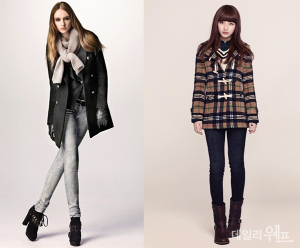 귀여운 여인으로 변신하는 코트 코디법도 있다. 떠오르는 신예 패셔니스타 Miss A 수지처럼, 떡볶이 코트라고도 불리는 체크 더플코트 + 남방을 입고, 스키니 한 데님 팬츠 + 어그부츠를 매치하면 옆집 여동생 같은 친근함과 사랑스럽게 표현된다.