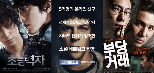 주말극장가에 3편의 영화가 박빙의 승부를 펼치며 관객 동원에 촉각을 곤두세우고 있어 눈길을 끈다. 영화 ‘초능력자’ ‘소셜 네트워크’ ‘부당거래’ 등이다.