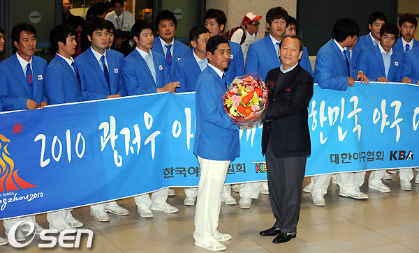 이날 공항에는 유영구 한국야구위원회(KB0) 총재와 이상일 KBO 사무총장, 대한야구협회 직원들이 마중을 나왔고 유영구 총재가 조범현 감독에게 꽃다발을 전달했다.