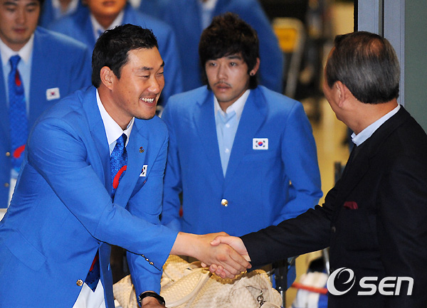 이날 공항에는 유영구 한국야구위원회(KB0) 총재와 이상일 KBO 사무총장, 대한야구협회 직원들이 마중을 나왔고 유영구 총재가 조범현 감독에게 꽃다발을 전달했다.