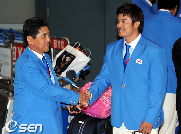 이날 공항에는 유영구 한국야구위원회(KB0) 총재와 이상일 KBO 사무총장, 대한야구협회 직원들이 마중을 나왔고 유영구 총재가 조범현 감독에게 꽃다발을 전달했다.