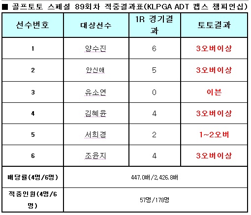 양수진(3오버 이상), 안신애(3오버 이상), 유소연(이븐), 김혜윤(3오버 이상) , 서희경(1~2오버 이상), 조윤지(3오버 이상) 등이 출전한 이번 회차에서는 지정선수 4명의 결과를 정확히 맞힌 참가자가 57명, 6명의 결과를 맞힌 참가자는 178명으로 총 235명의 골프팬이 적중의 기쁨을 누렸다.