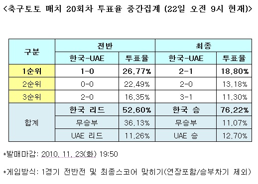 [축구토토] 체육진흥투표권 수탁사업자인 오리온그룹 계열의 스포츠토토(www.sportstoto.co.kr)는 오는 23일 저녁 8시(한국시간) 중국 광저우 톈허 스타디움에서 열리는 2010 광저우 아시안게임 축구 8강전 한국-아랍에미레이트(UAE)전을 대상으로 한 축구토토 매치 20회차 투표율을 중간 집계한 결과, 국내 축구팬 76.22%는 한국의 승리를 전망했다고 밝혔다.
