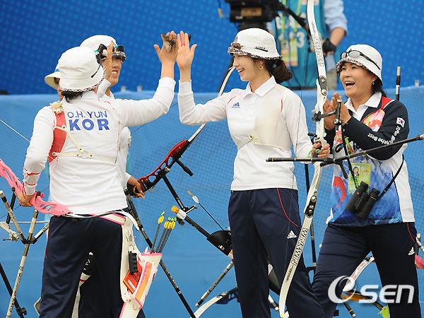 윤옥희는 주현정-기보배와는 다른 스타일. 조 감독은 "경험이 많고 스스로 부담을 이겨낼 수 있는 선수를 마지막에 놓고자 했고 고심 끝에 윤옥희를 넣었다. 본인도 3번 궁사가 이렇게 힘든지는 처음 알았다고 하더라"고 밝혔다.