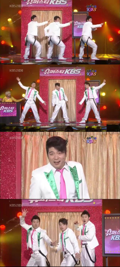 흰 양복에 분홍넥타이, 카라처럼 멜빵을 밑으로 내린 다소 촌스러운 패션으로 등장한 이들은 섹시하게 골반을 튕기며 흔드는 카라의 엉덩이 춤을 코믹하게 변형시켰다. 엉덩이를 엉거주춤 내리고 어기적어기적 걷는 엽기버전으로 능청스럽게 소화해내 폭소를 유발한 것.