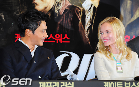 장동건과 케이트보스워스가 기자회견중 마주보며 환하게 웃고 있다./rumi@osen.co.kr