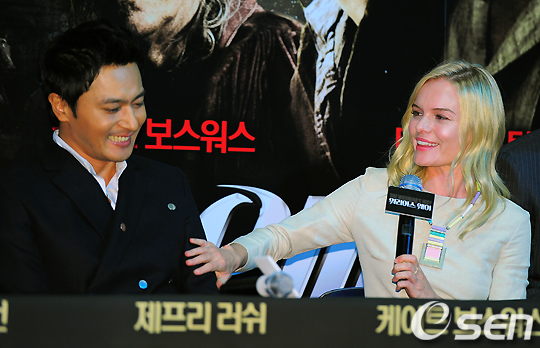 기자회견중 케이트보스워스가 장동건을 만지며 다정하게 얘기를 나누고 있다./rumi@osen.co.kr